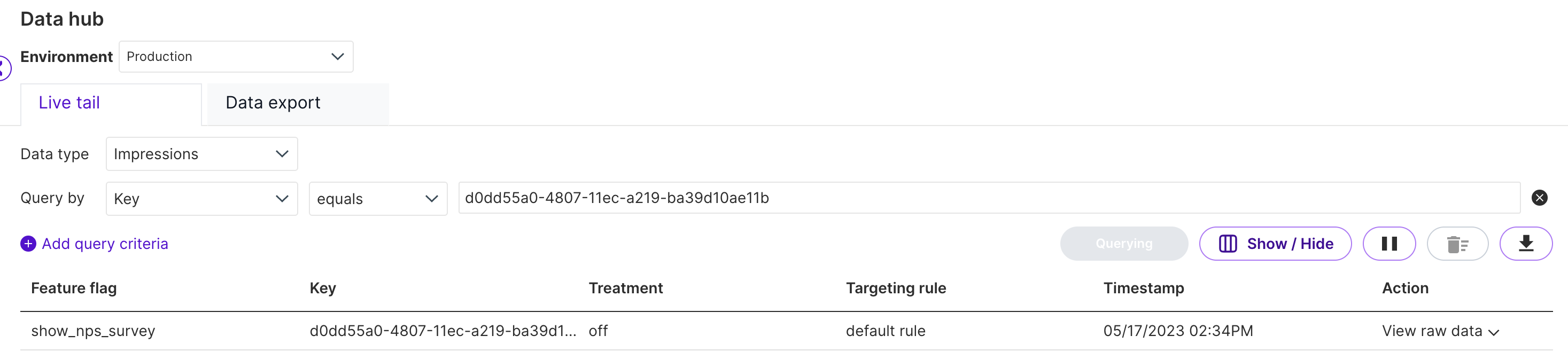 - From a feature flag page, you can also click the Live tail tab for a filtered view of impressions for that flag.