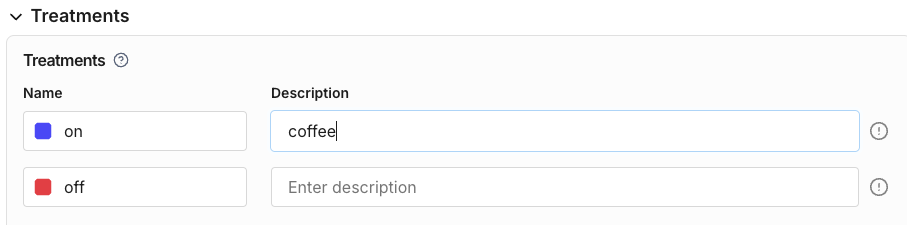 Every feature you want to release in FME has at least two treatments. In the simplest case, these are on and off. You can edit the treatment's name and description as well as add additional treatments at any time.