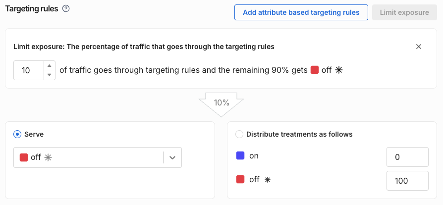 When you create a feature flag, you can limit the feature flag's exposure. Limiting exposure means limiting the percentage of traffic that is channeled through a feature flag, allowing the rest of the traffic to be unaffected by, or to remain outside of, the targeting rules. The users outside of the flag's targeting rules will be given the default treatment.