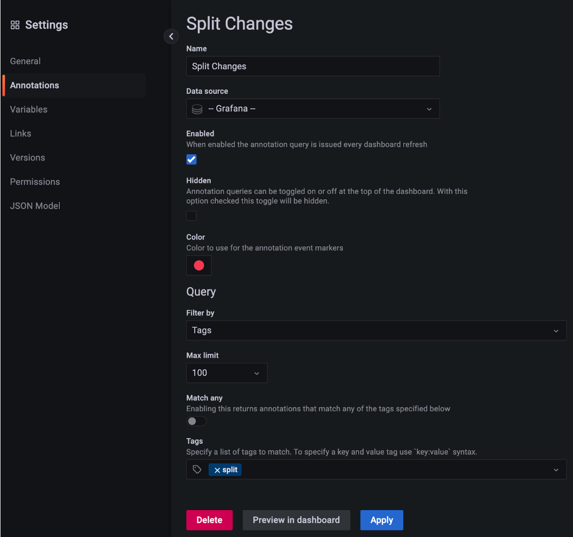 You can send audit log notifications to Grafana as chart annotations. This Harness FME audit log webhook abridges notifications into chart annotations for Grafana. The annotations are tagged as 'split' so that a Grafana user can put an annotation query on any dashboard to see Harness FME notifications. You can read about Grafana Chart Annotations. A single node.js lambda does the work for the integration, using only the filesystem (for API keys) and the Axios HTTP client. The integration receives audit log notifications, abridges them into new annotations, and calls the Grafana annotation API to create new annotations.