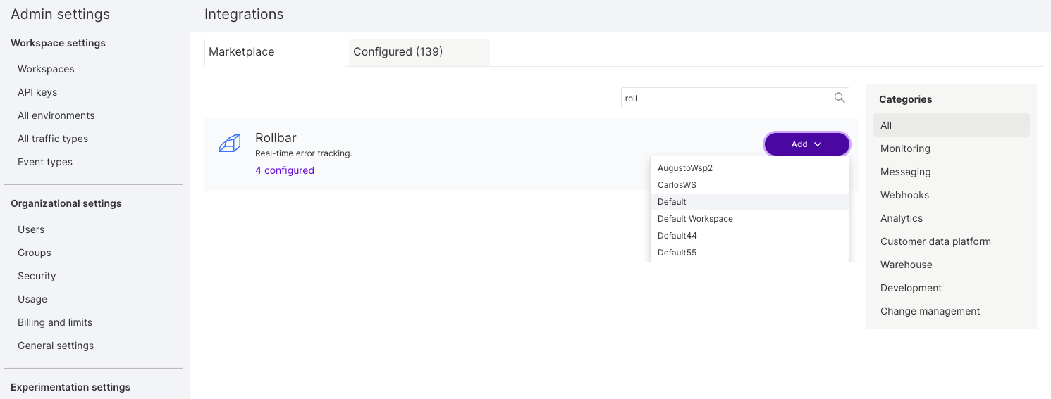 Click Add next to Rollbar and select and select the project for which you would like to configure the integration.