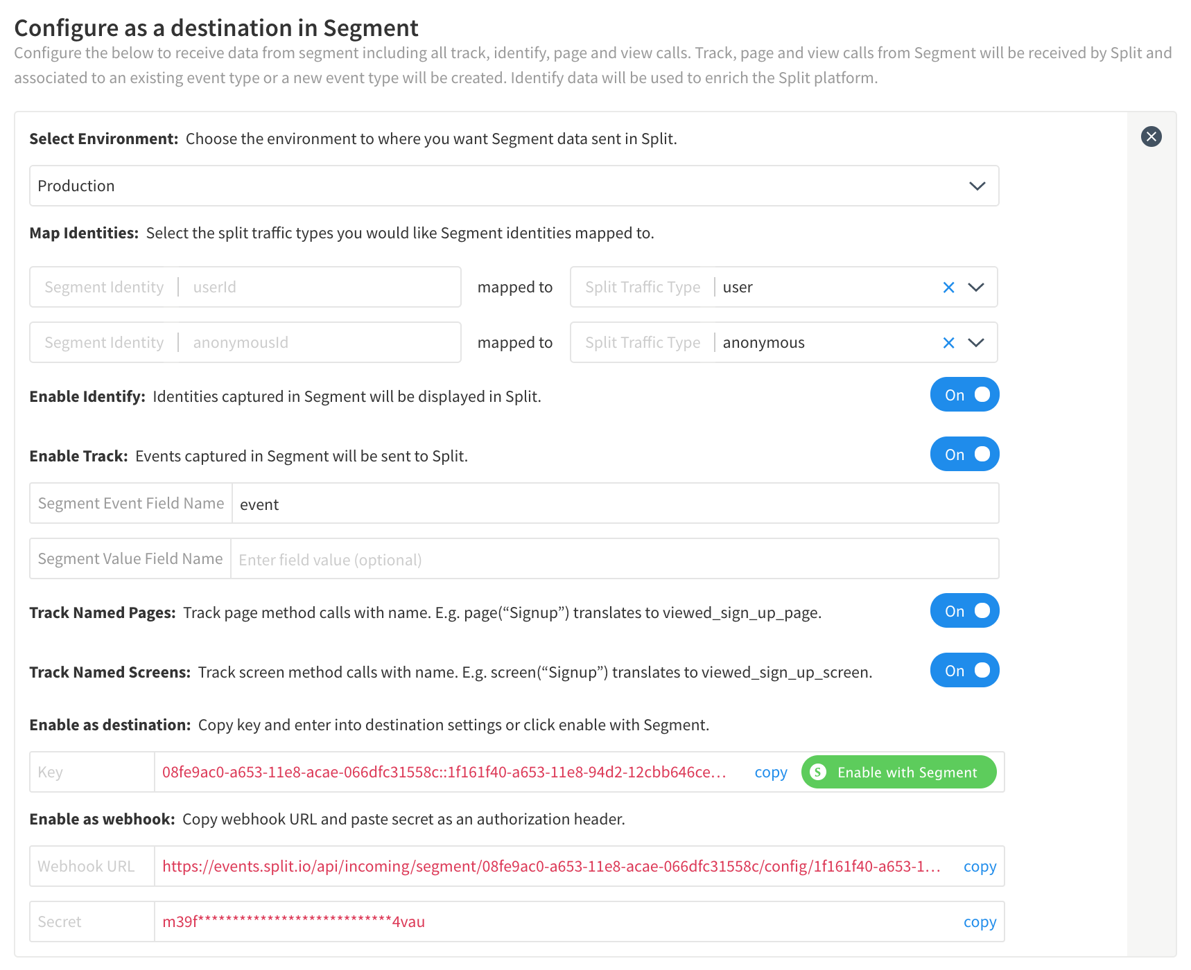- Enable identify: When enabled, identities captured in Segment are mapped to the traffic types you selected above and displayed in Harness FME.