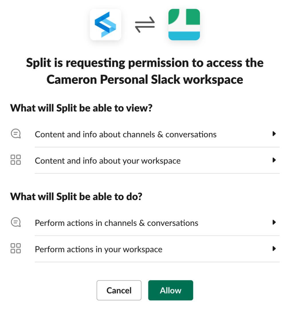 In the Slack authorization page, you see a page with the message explaining the permissions required by the Split Slack app. Click the Allow button. You’re prompted to open Slack.