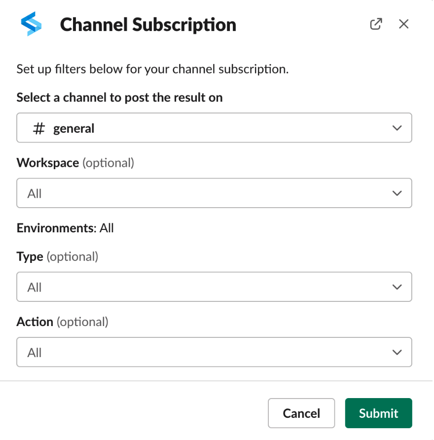 Use the /split subscribe command to create a channel subscription, which subscribes your Slack channel to Harness FME notifications. The Channel menu list is pre-selected with the current channel. However, a user can select a different channel if desired. Optionally select your desired filter criteria and click Submit to create the channel subscription.