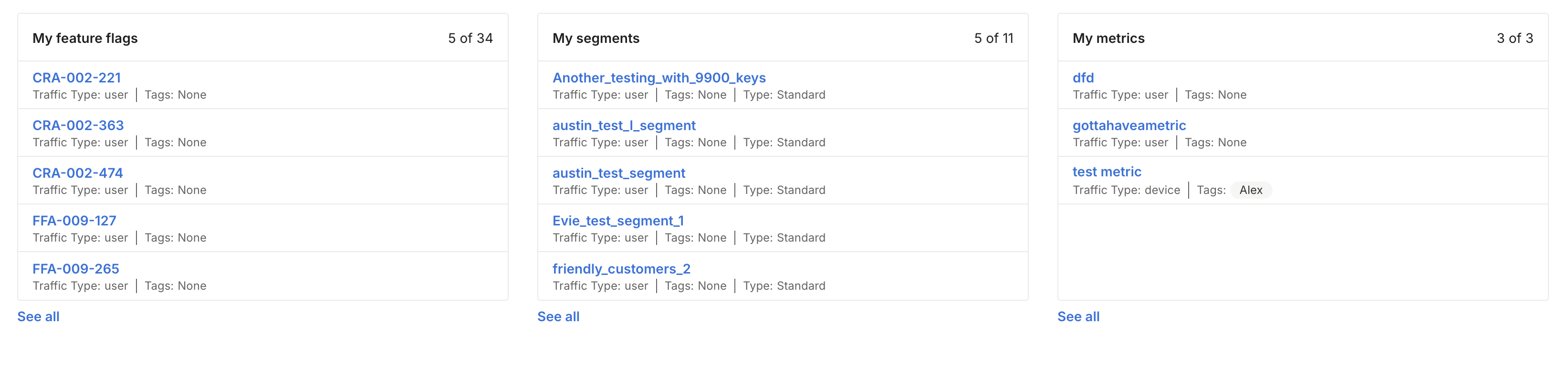If you own any feature flags, segments, or metrics, they appear in this section for quick navigation links to see the objects you own.