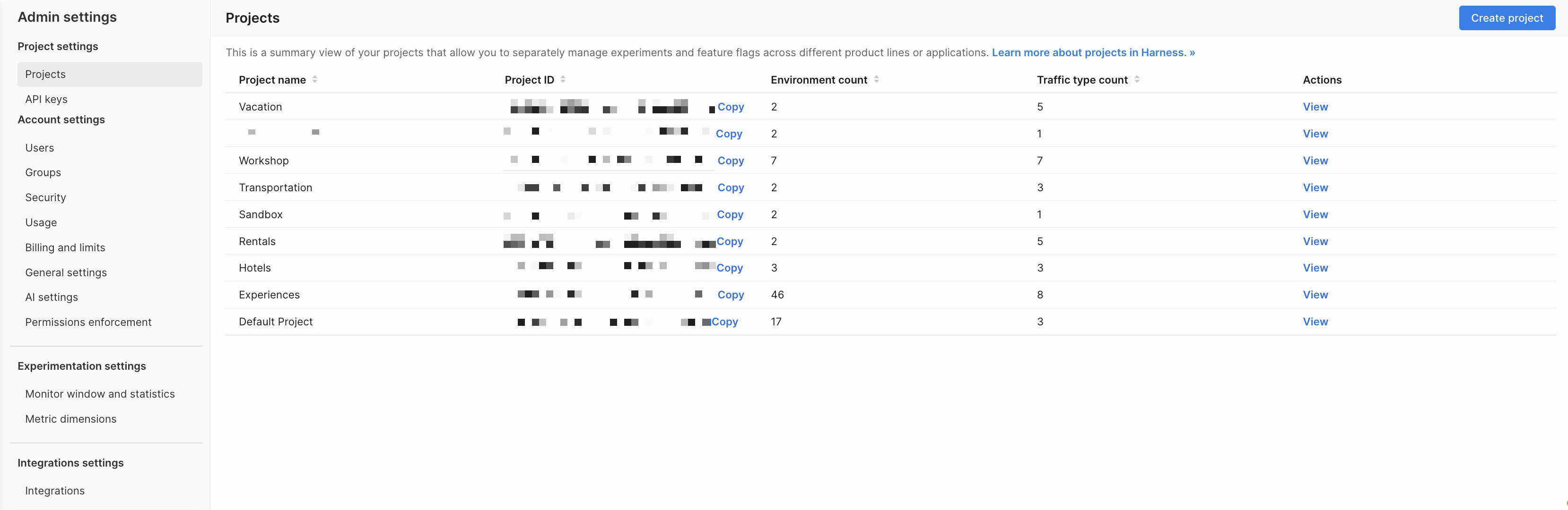 - Manage the environments and traffic types in a project by clicking View in the Actions column for selected projects.