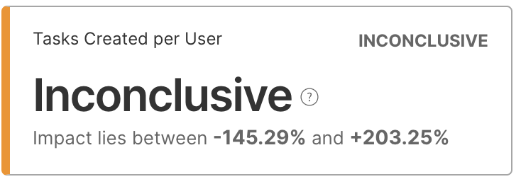 Each metric for a given test will only have enough power to detect impacts greater than a given size -- this is the metric’s minimum likely detectable effect (MLDE). Getting an inconclusive result means it is unlikely that your test had an impact greater than this MLDE, in either direction, but there could be an impact smaller than this value that the test was not able to detect given the current number of experimental units. The current MLDE can be displayed by hovering over the question mark on your inconclusive metric card.