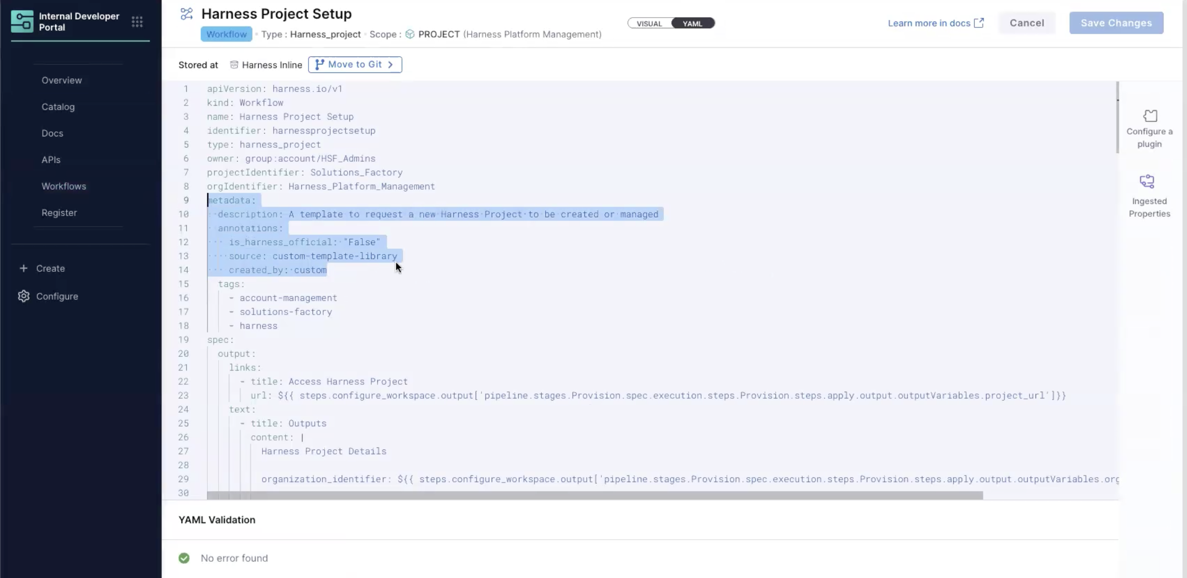 custom-harness-template-library/harness-project/.harnessgo intocatalog_template.yamland find the propertiestemplate_library_connectorandtemplate_library_repoand paste in the Ids from above after “variable.account.” It should look like this:
