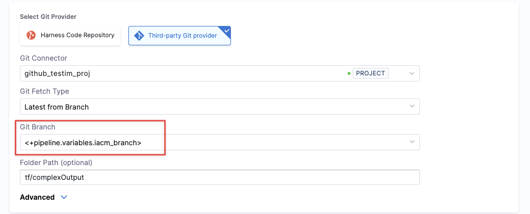 value: <+input>.default(main)- (Optional) Enter Folder Path: If your IaC code resides in a subdirectory, specify the folder path.