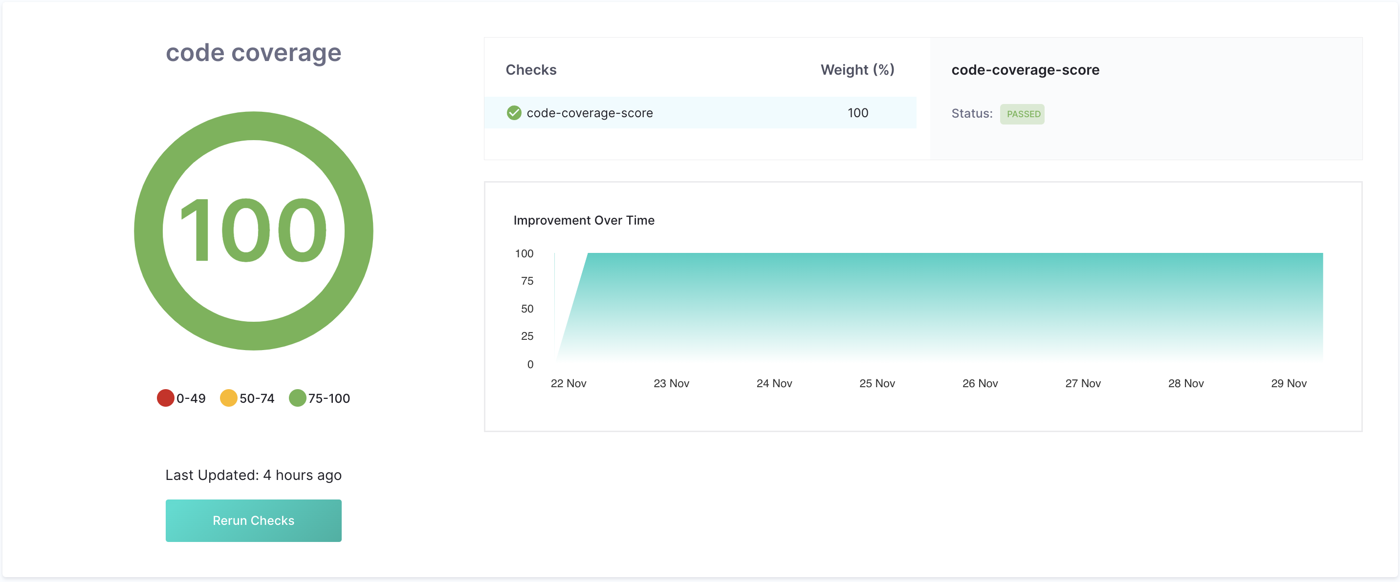 - Now go to the Warehouse Software Component in the Catalog, and you'll find the Code Coverage Scorecard under Scorecards tab and on the overview page. You can read more about it here