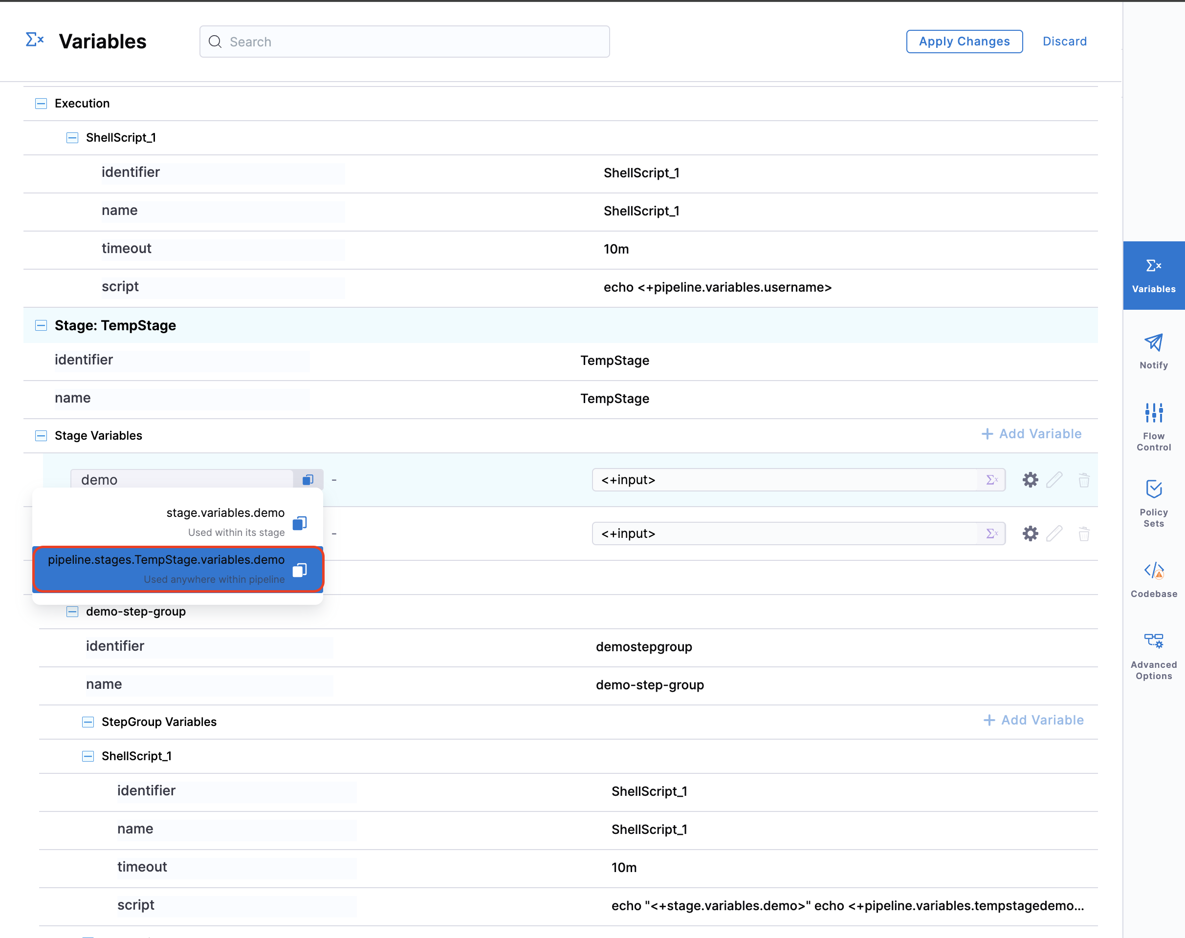 If you need to reference lower-level variables (such as stage, step group, and step variables) from outside their original scope, you must include the relative path to that variable. For instance, if you want to reference a stage variable from a different stage, you should use the format, pipeline.stages.originalStageID.variables.variableName