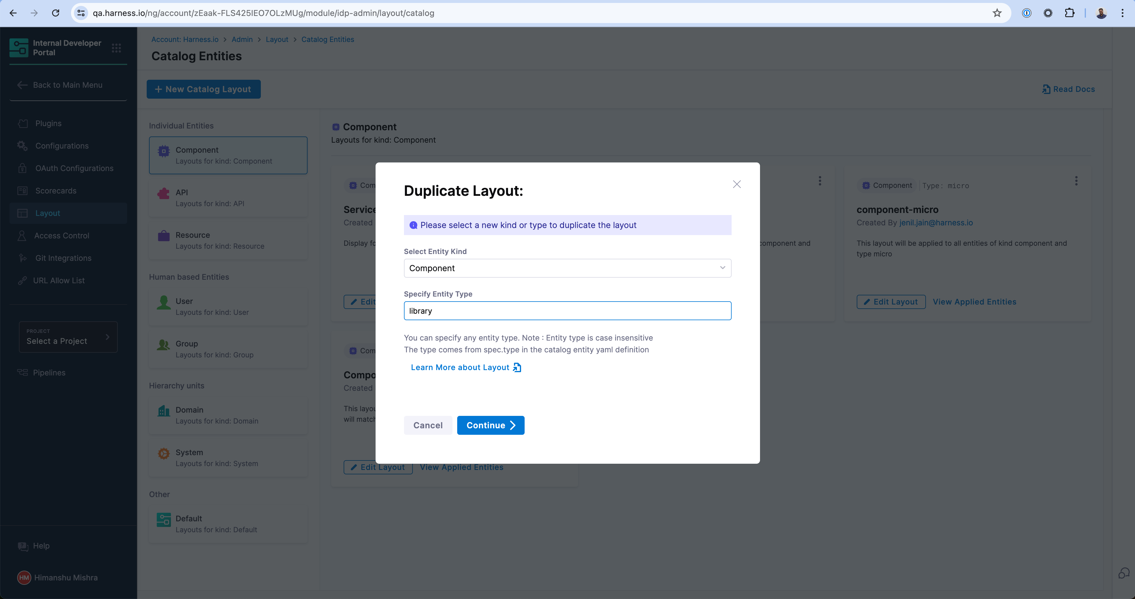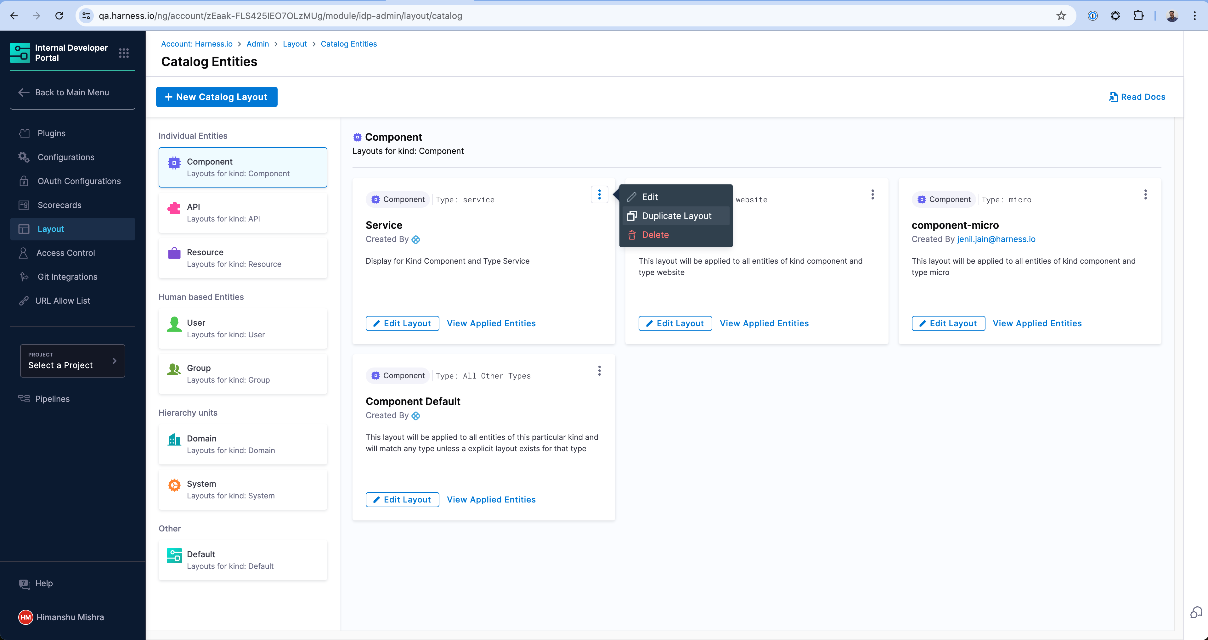 - Go to the Layout Page and under Admin and select Catalog Entities.