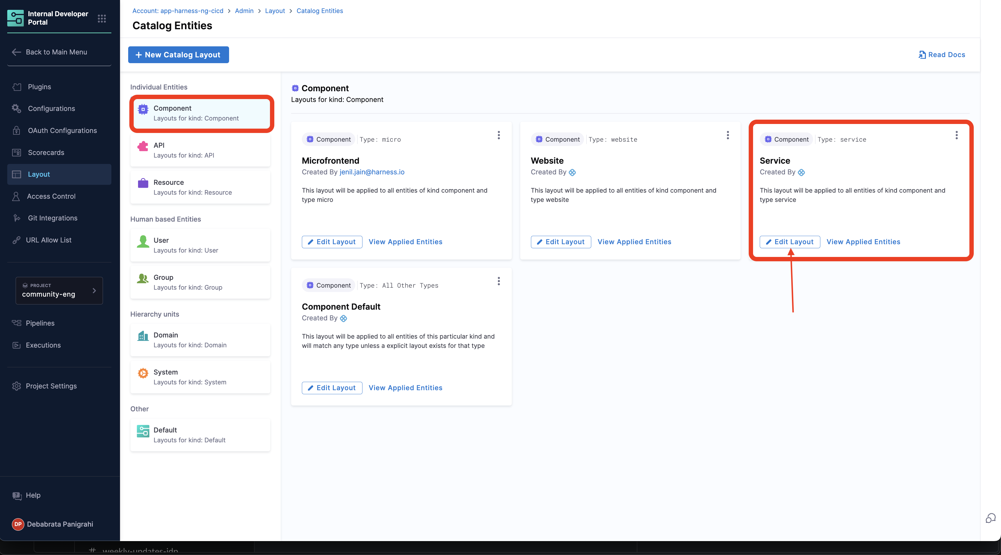 The Layouts are grouped by the kind of the Catalog entities and their use-cases in the sidebar. As you can see there are a number of layouts possible for a particular kind. For example, the first layout in the screen will match any Catalog entity with kind: Component and spec.type: service. Similarly, there is a different layout for spec.type: website. At the end, there is a catch-all layout which will be used for any other type which has not been explicitly created above.