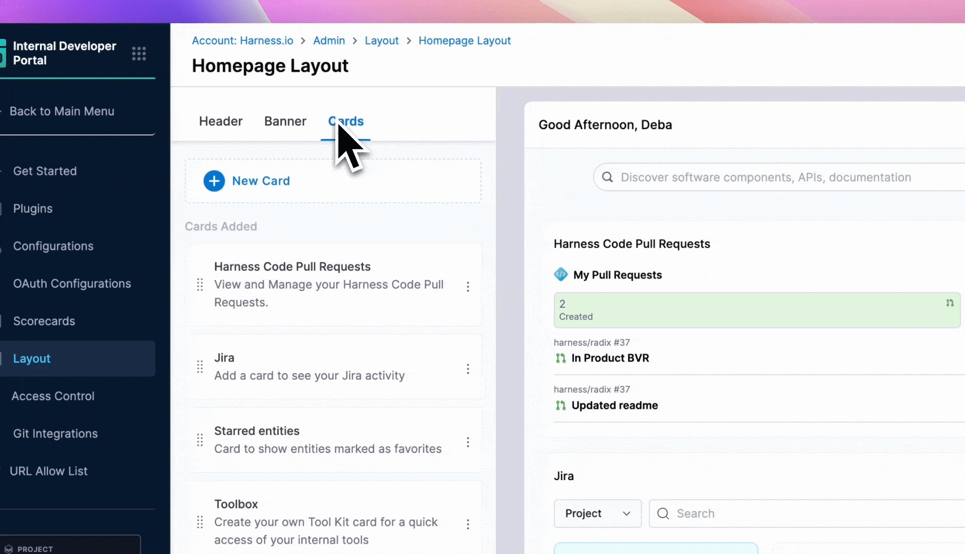 The Platform Admins can customize the homepage under Layouts for 3 different categories Header, Banner and Cards. A preview of the changes with sample data is available while customizing the homepage. The cards can be of two width sizes, i.e., medium(6md) and large(12md).