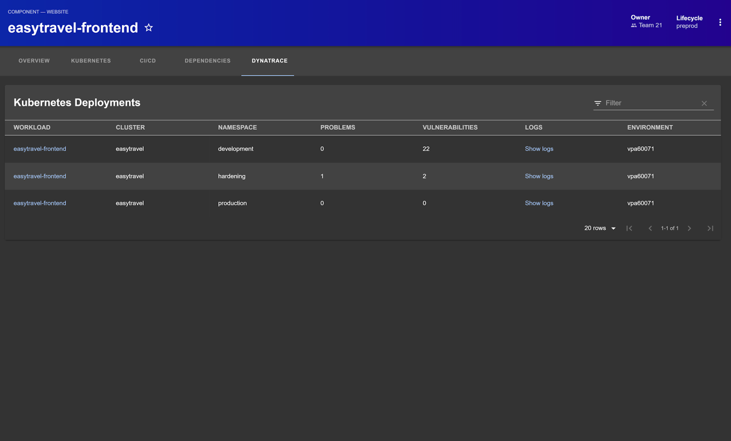 To show information from Dynatrace for a catalog entity, add the following annotation to catalog-info.yaml: