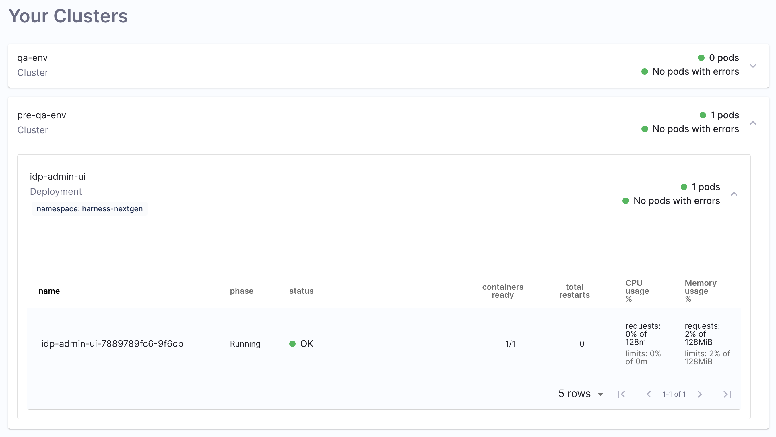 The Plugin displays the information on your cluster and health of the pods under these clusters, including information on namespace and CPU and Memory usage.