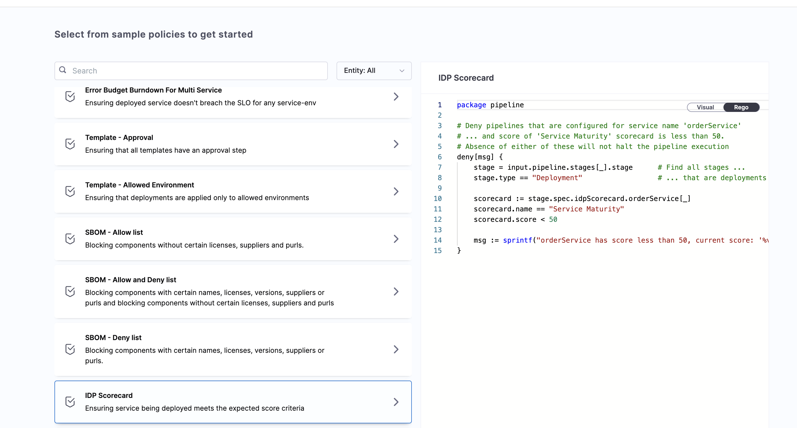 In this tutorial, you learned how to use Harness Policy As Code with OPA to enforce governance rules based on scorecard scores. By creating policies and policy sets, you can ensure that services meet quality standards before pipelines are saved or deployed.
