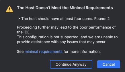 If your Gitspace does not meet the recommended requirements, the following warning may appear during your Clion setup. You can choose to create a new Gitspace that adheres to the recommended specifications or proceed with your existing configuration.