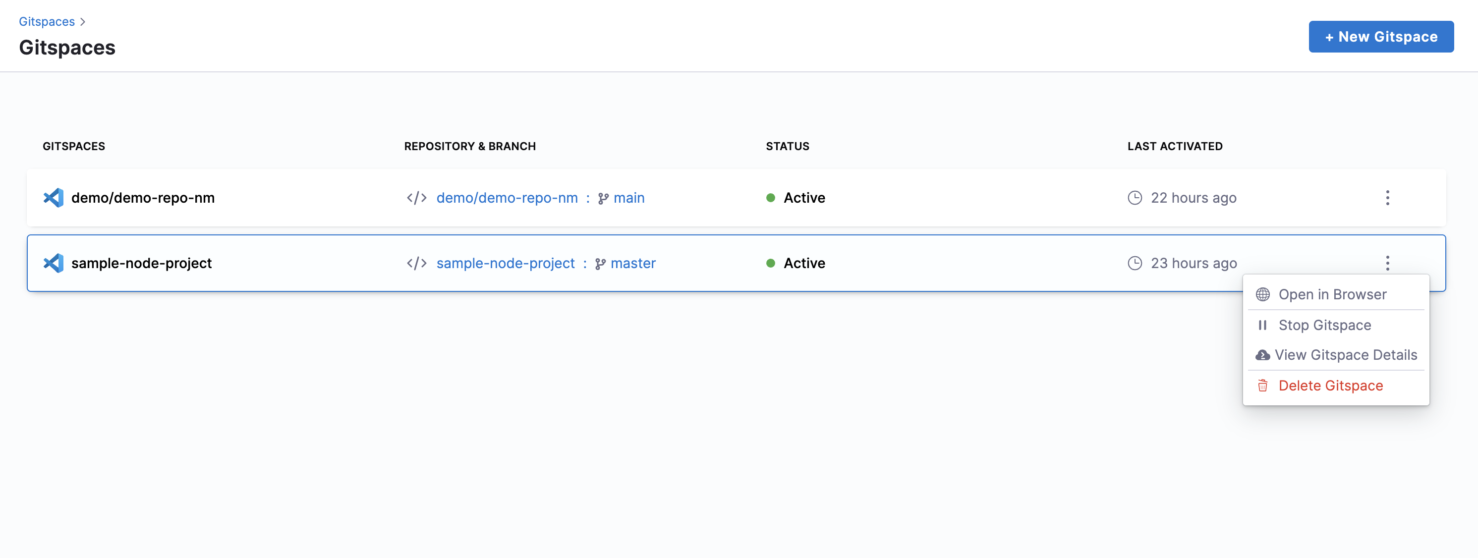 On the Gitspace Page click on the 3 dots and select Delete Gitspace. You will see a warning stating that this action cannot be undone. If you are sure you want to delete the Gitspace, click on Delete.