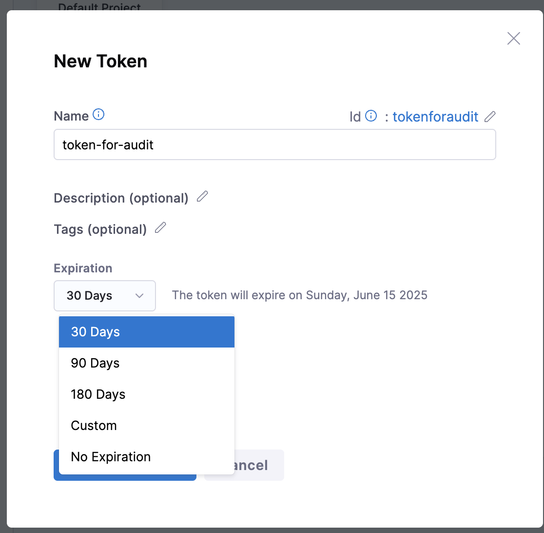 When creating a token, you can choose how long it stays active. You can set it to expire in 30, 90, or 180 days — or pick a custom date. If you don't want it to expire, select No expiration.