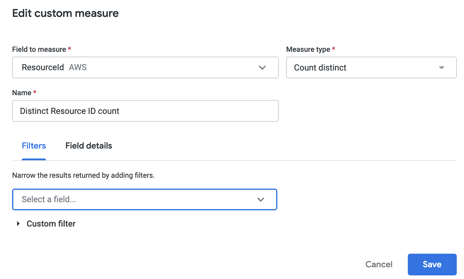 - In Edit custom measure, in Field to measure select the field for which you want to create measure. For example, Resource ID.
