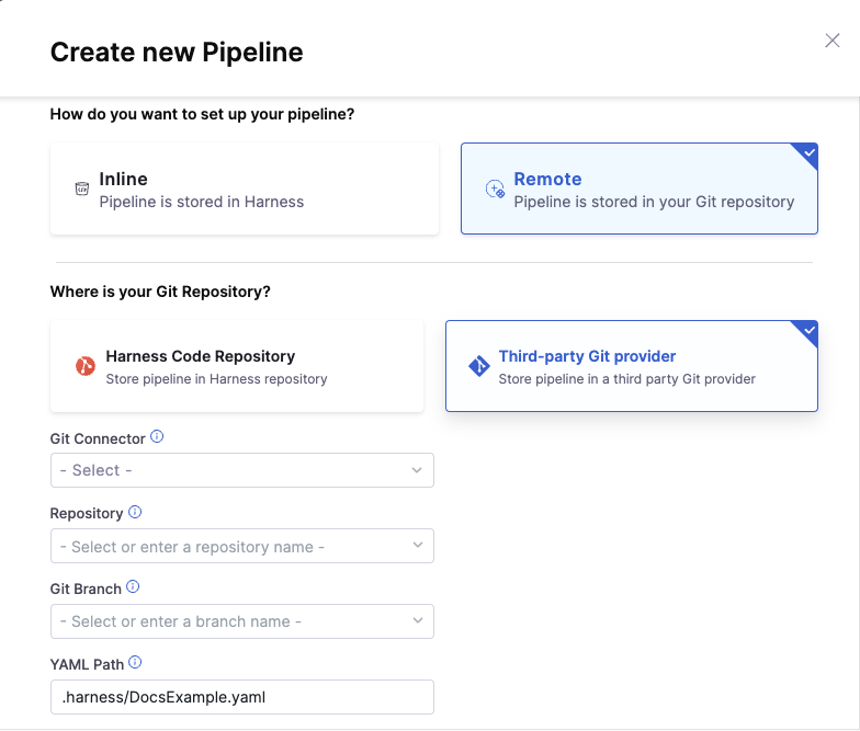You can also store your configurations in Harness, by selecting the Inline option while creating resources. For more information on creating an inline pipeline, see Pipelines and Stages.