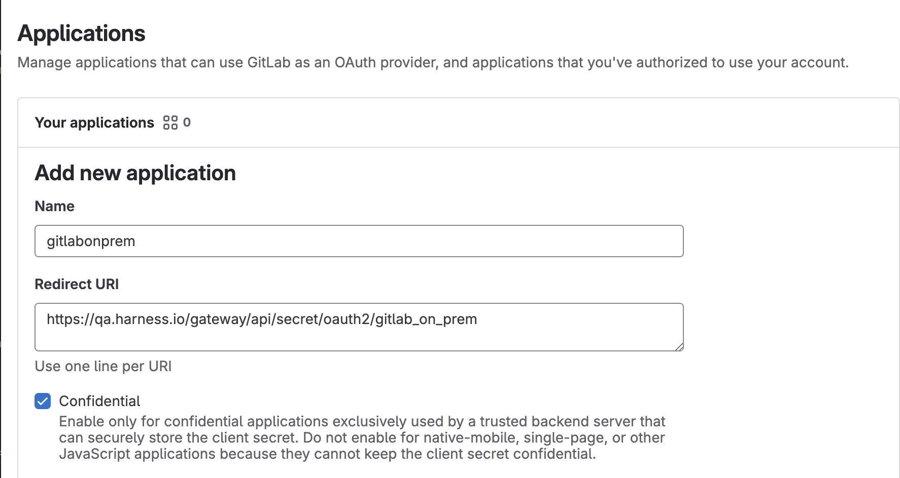 Currently, support for OAuth configuration with the self-hosted and onprem Gitlab provider is behind the feature flag and PIPE_ENABLE_GITLAB_ON_PREM_FLOW . Please contact Harness support to enable this feature.