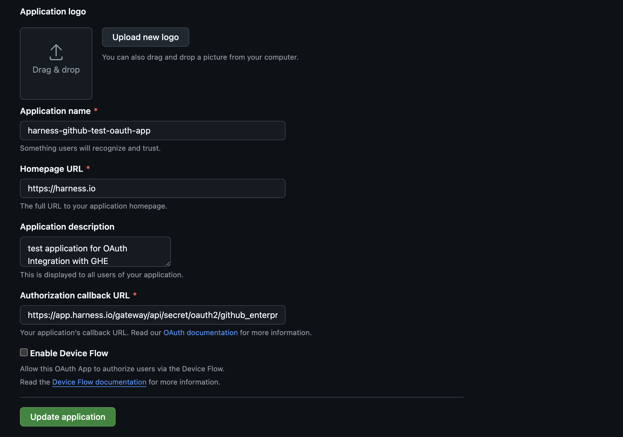- Copy the Redirect URL provided on the Harness Credentials page and use it to update the Authorization callback URL in your GitHub Enterprise OAuth App.