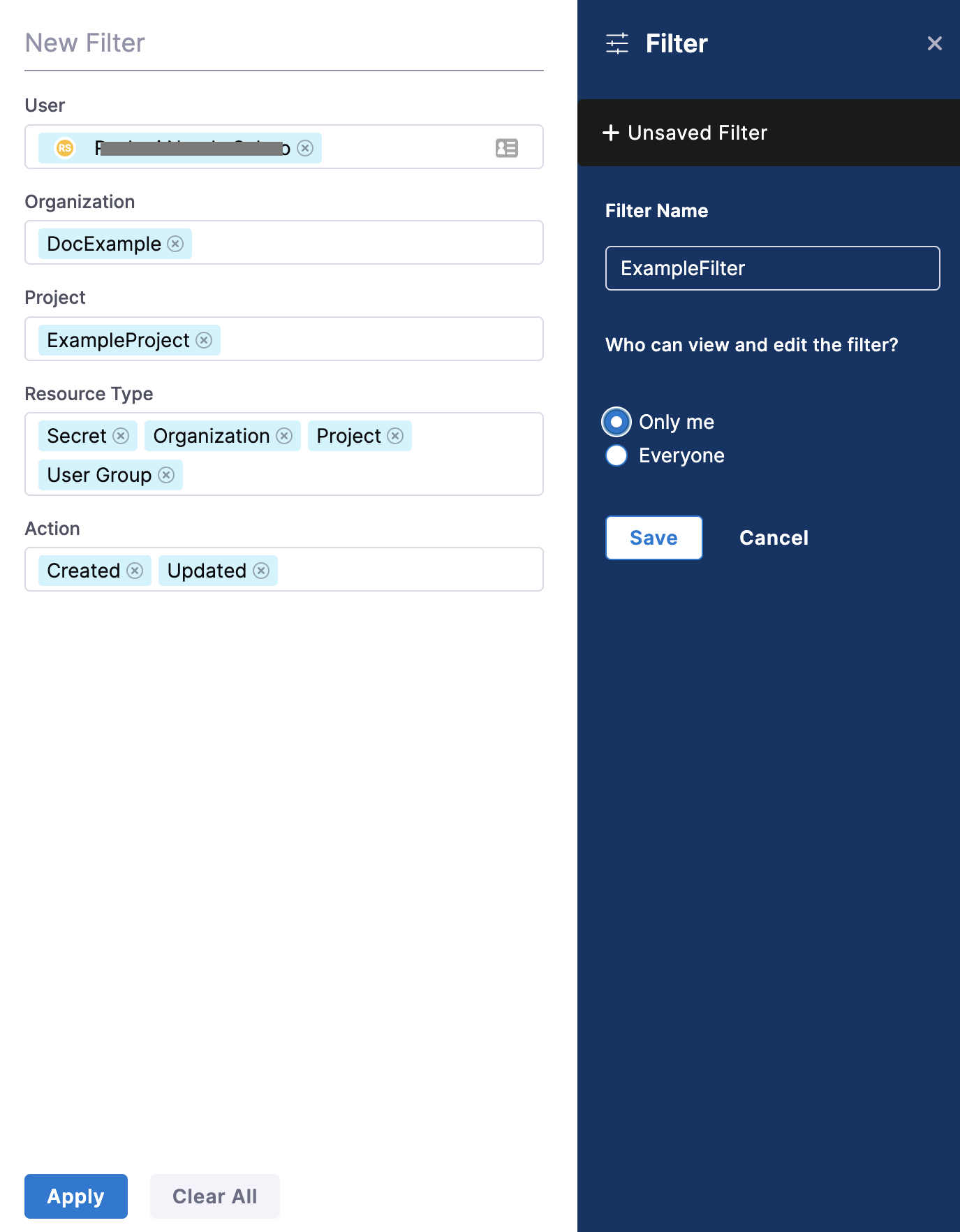 In the New Filter settings, select filters to refine audit events. Narrow the viewable events by adding filters and selecting: