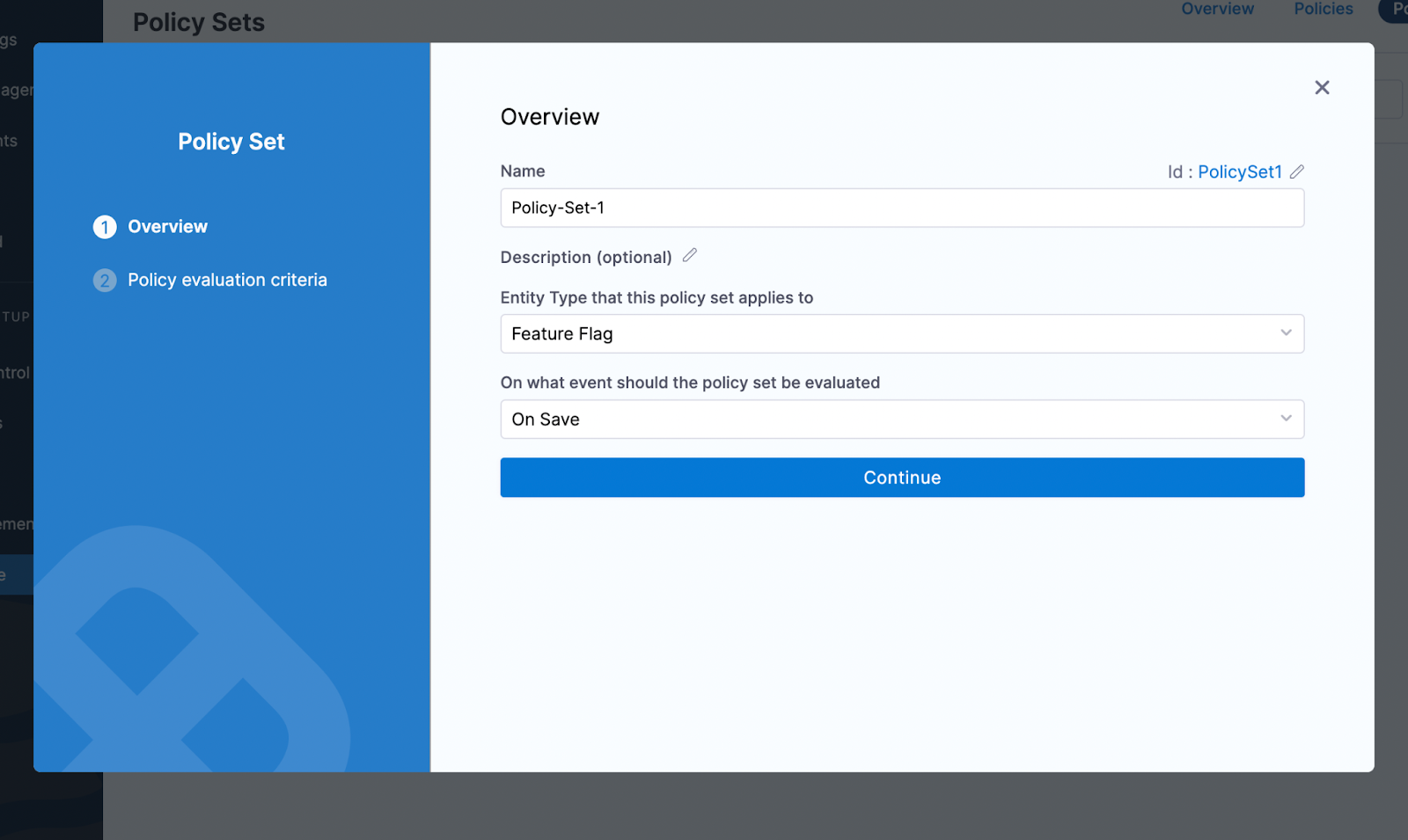 In On what event should the Policy Set be evaluated, select On save, then click Continue.
