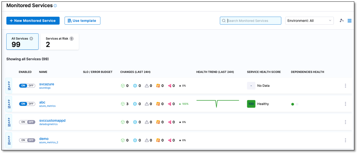 - In Harness, select Deployment > Monitored Services. A list of monitored services is displayed. The list also displays the number of health sources configured for each monitored service.