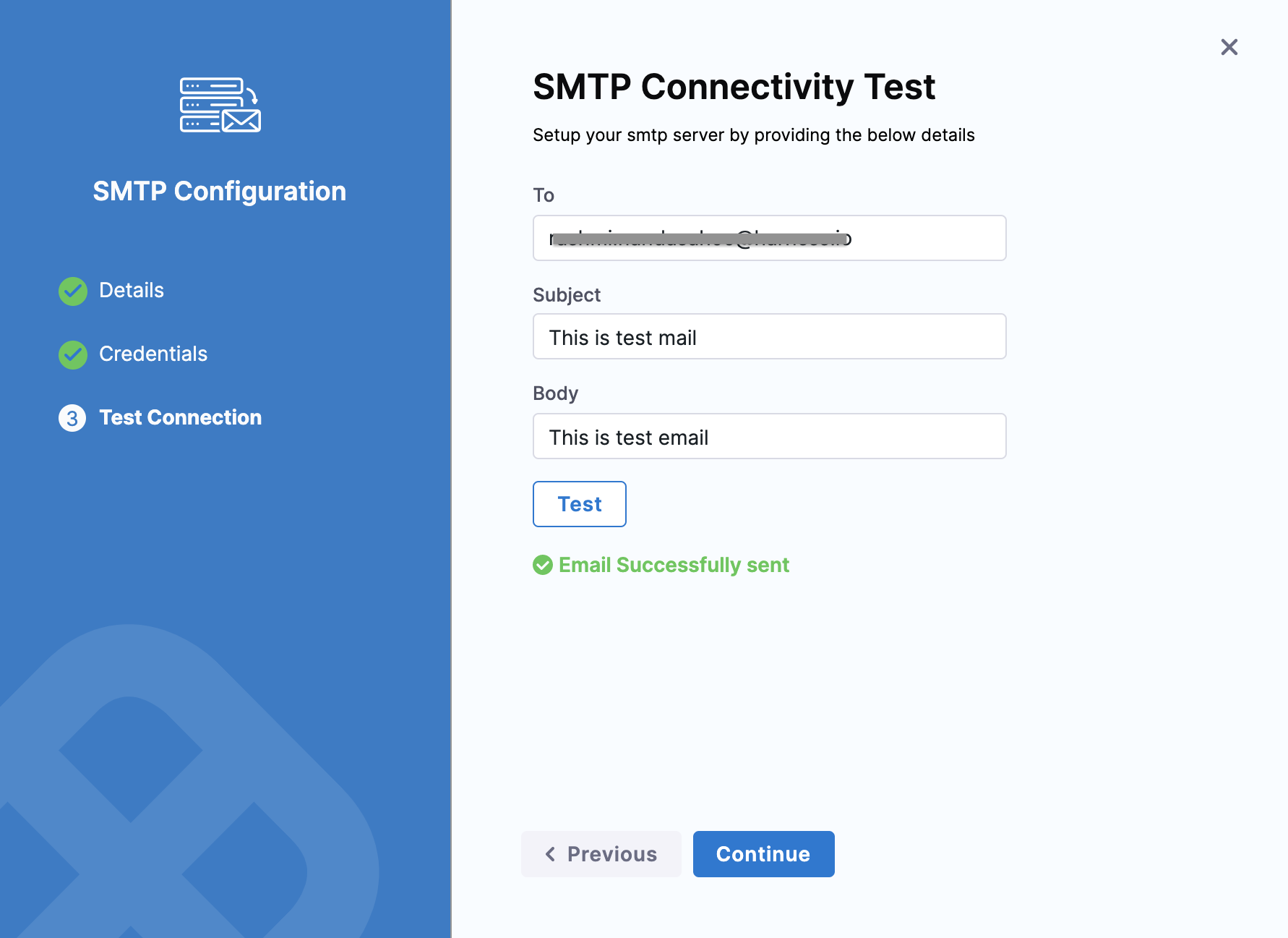 Click Continue after the test is successful.