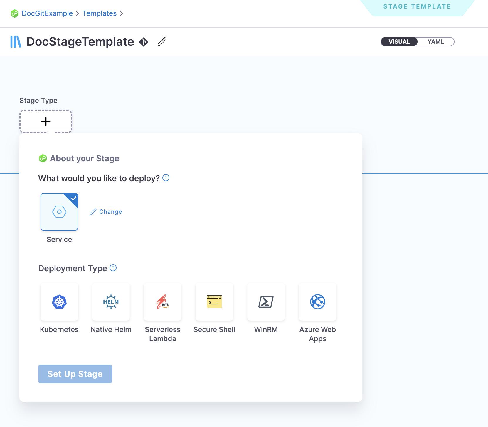 This example uses the Deploy stage. The Deploy stage type is a CD stage that enables you to deploy any service to your target environment.