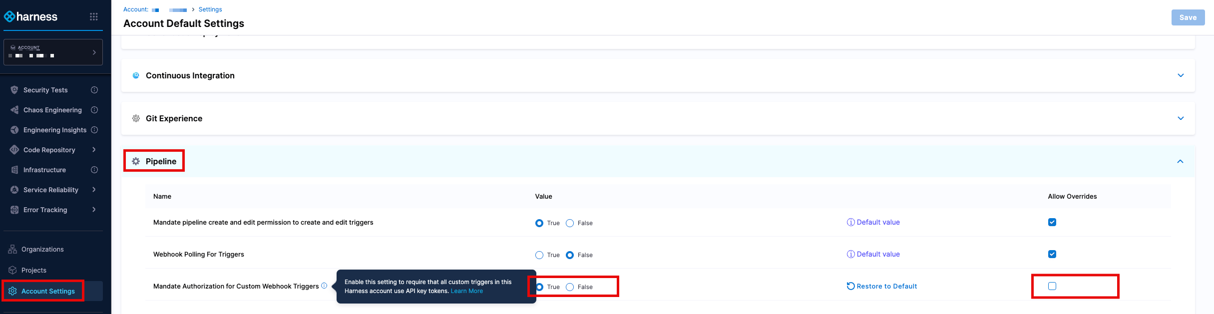 - When the Allow Overrides box is selected at the account level, Harness users will be able to select a different value for this setting at project level. For example a project, in Default Settings > Pipeline may have a a different value for Mandate Authorization for Custom Webhook Triggers, when compared to the Account or Organization settings. Remove the ability to override this setting to ensure that the authorization is enforced and cannot be adjusted.