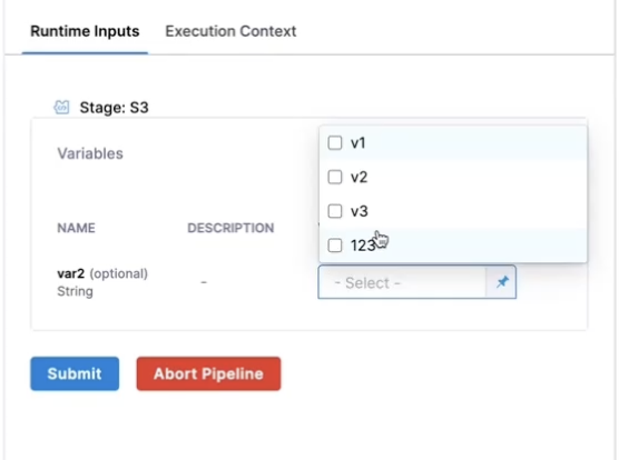 value: <+input>.executionInput().allowedValues(<+pipeline.stages.custom_1.spec.execution.steps.ShellScript_1.output.outputVariables.name>,<+pipeline.stages.custom_1.spec.execution.steps.ShellScript_1.output.outputVariables.version>)