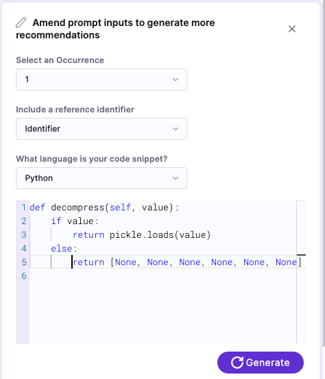 Add any additional context in the text pane. For example, you might want to include relevant code immediately before the snippet where the vulnerability was identified, in addition to the snippet itself. Then select Generate.
