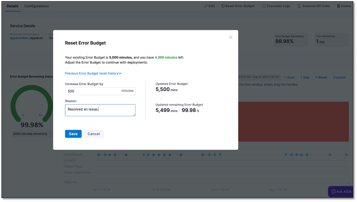 Specify the number of minutes by which you want to extend the error budget, and provide a reason for this adjustment. The updated error budget and the remaining budget are displayed.