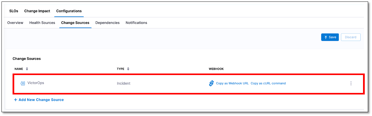 On the Configurations page, go to the Change Sources tab. In the Change Sources section, a list of change sources that have been added to the monitored service is displayed. The list also displays webhook URLs and cURL commands next to each change source.