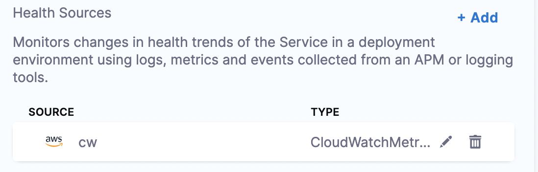 In Harness, a health source is a mapping that connects a Service in Harness to a service running in a deployment environment that is being monitored by an Application Performance Monitoring (APM) or logging tool. This mapping allows Harness to collect metrics and data from the APM or logging tool and use it to determine the health and status of the Service in Harness. This topic describes how to set up CloudWatch as a health source in a monitored service.