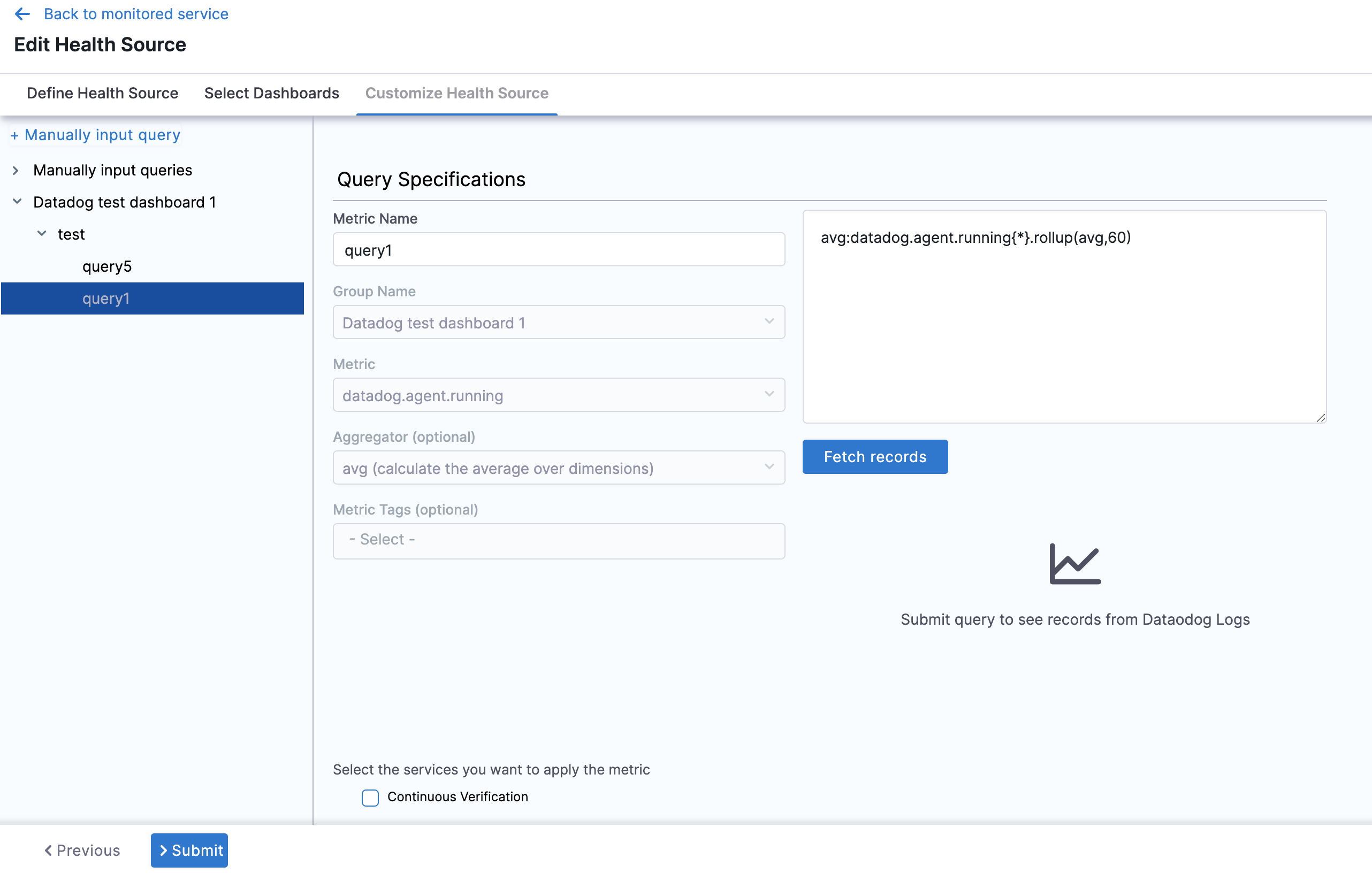 Click Submit. The Datadog health source gets added to the monitored service.