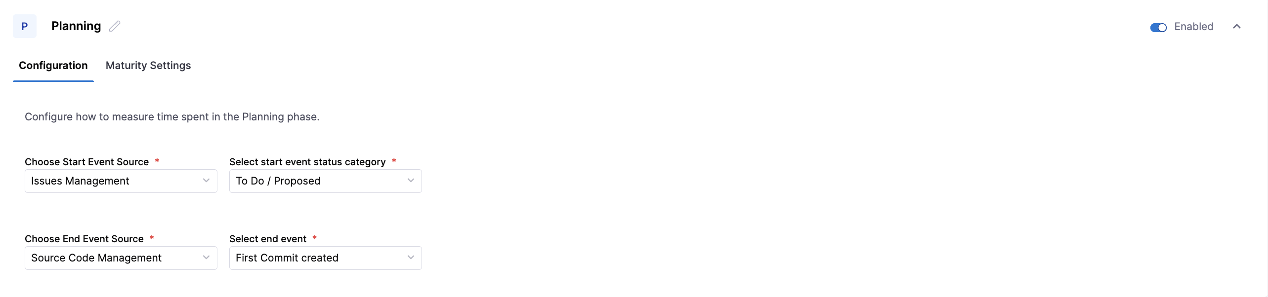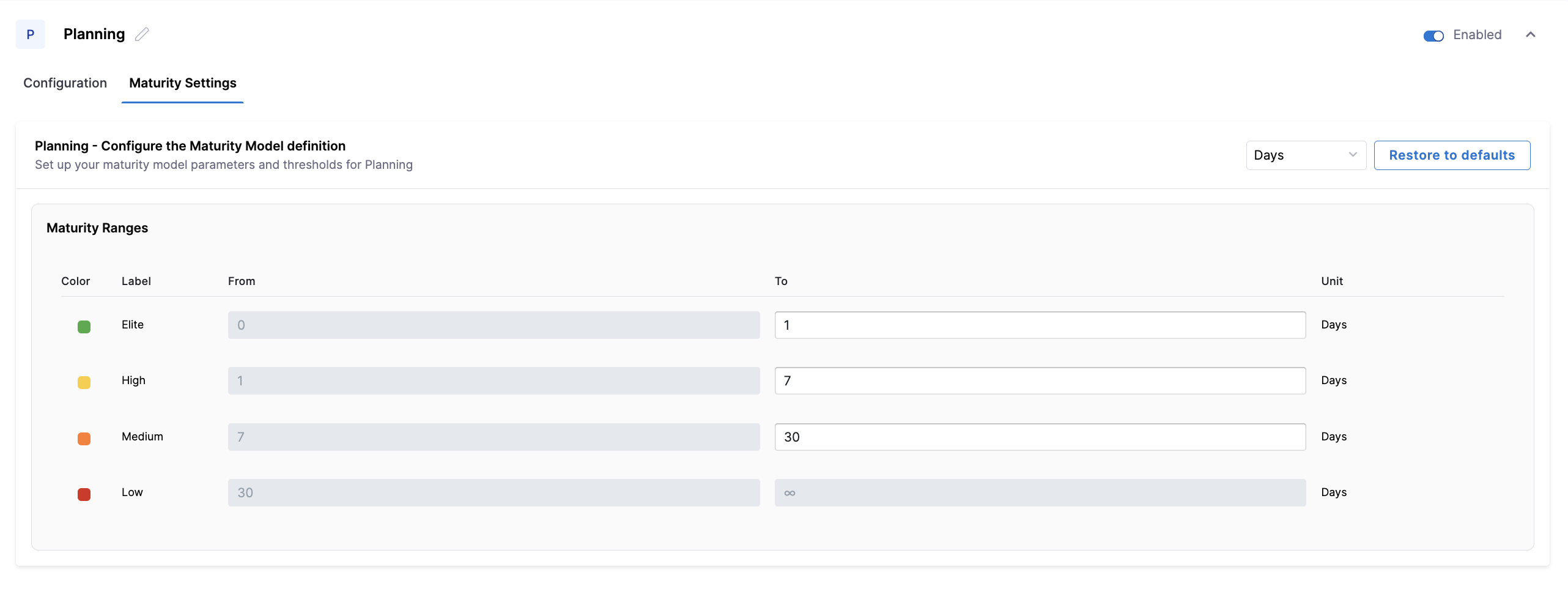 Configure the maturity thresholds used to classify Planning lead time. You can adjust the Elite, High, and Medium ranges to reflect how quickly work is expected to move from ideation into active development for your teams.