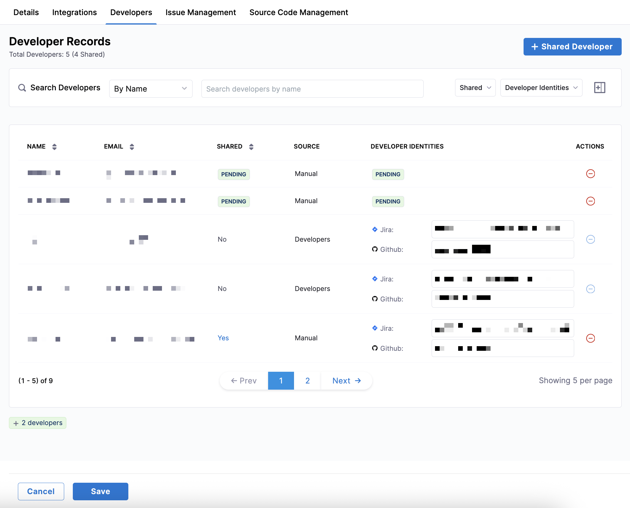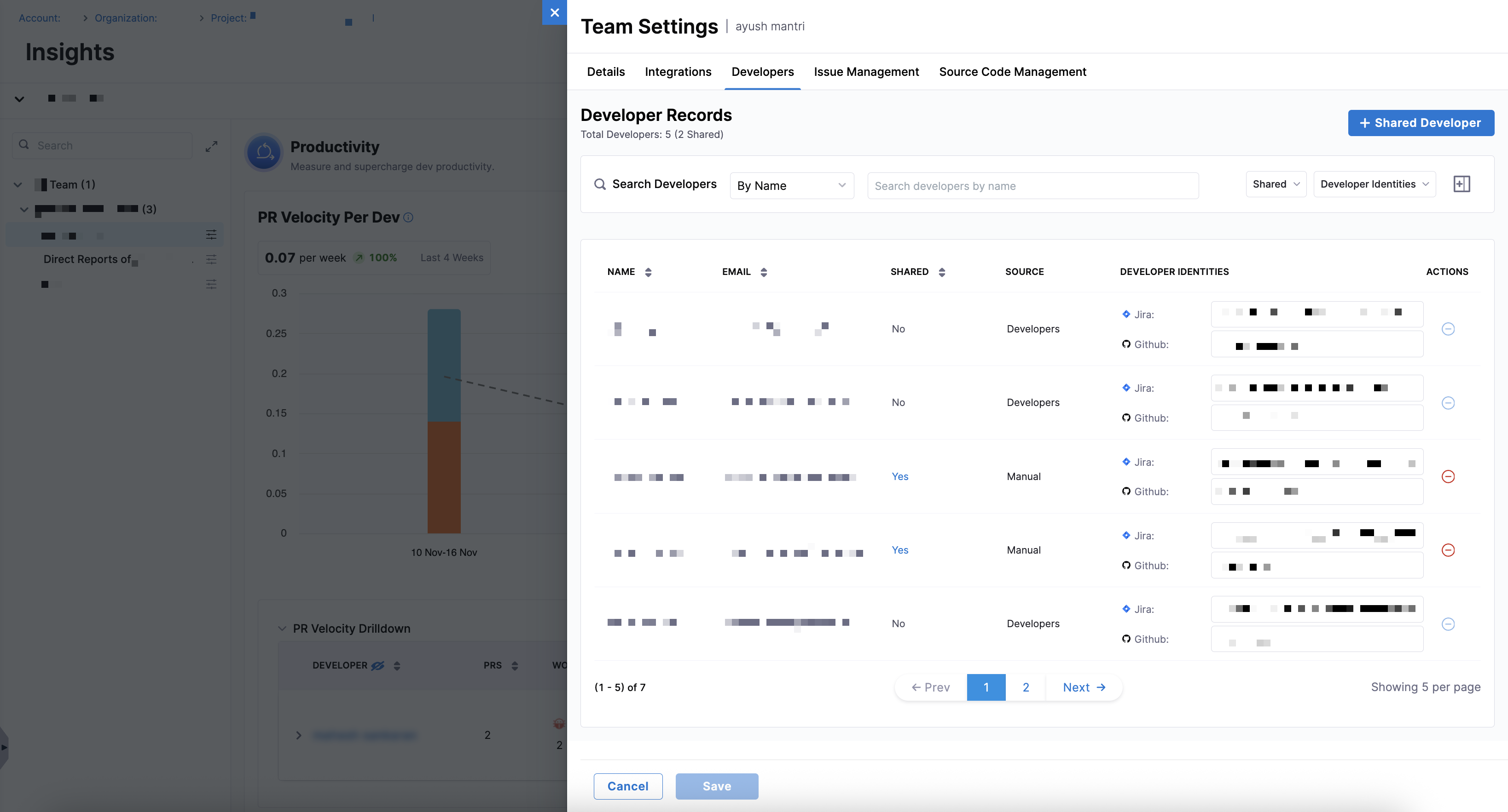 In addition to identity mapping, the Developers tab in Team Settings allows you to add contributors who are not inherited from the Org Tree but still affects the selected team's metrics. While inherited developers appear with Source: Developers and Shared: No, shared developers appear with Source: Manual and Shared: Yes.