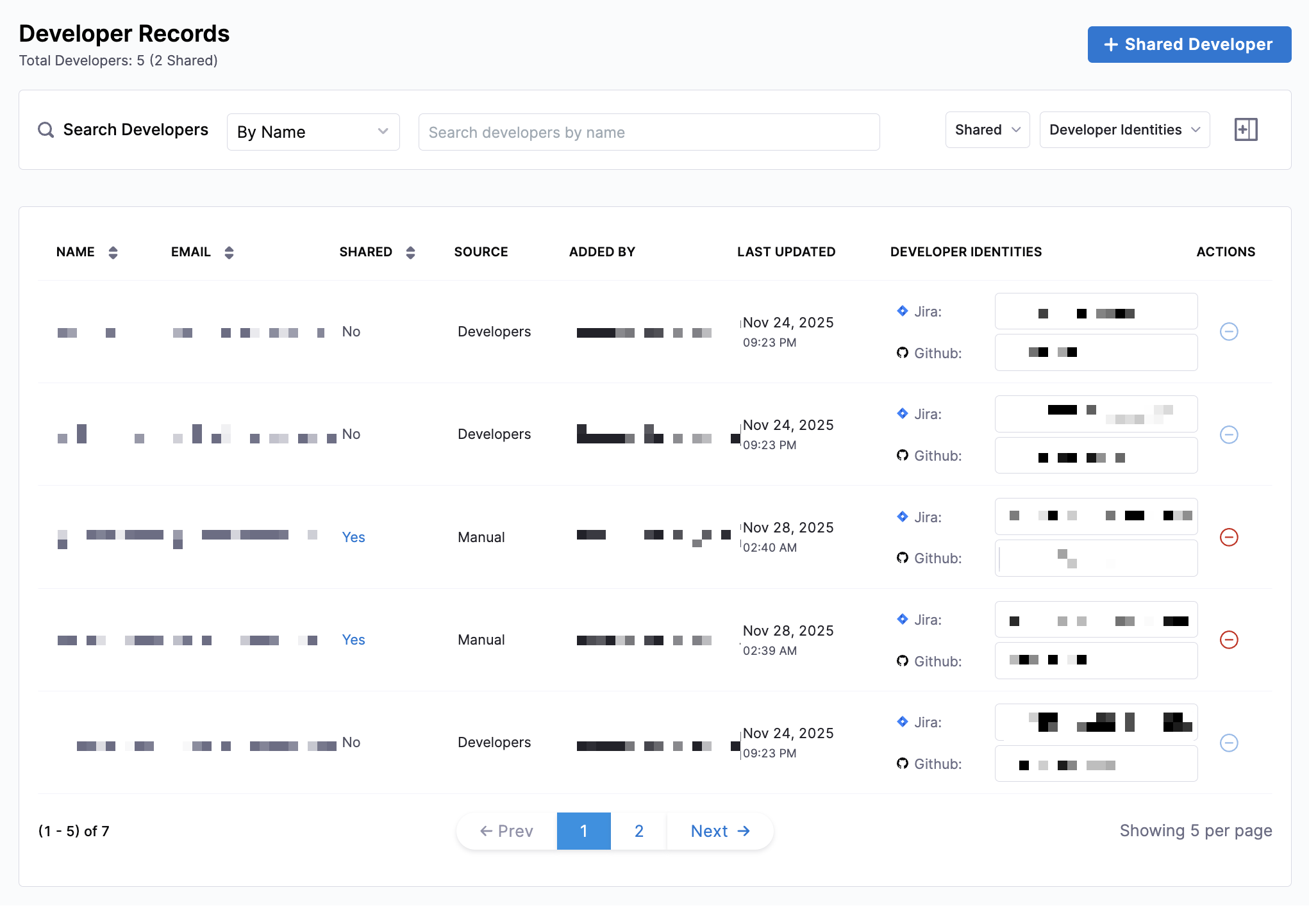 • Source: Developers added through the API or CSV upload, appear with Source: Developers. Developers added in the UI appear with Source: Manual.