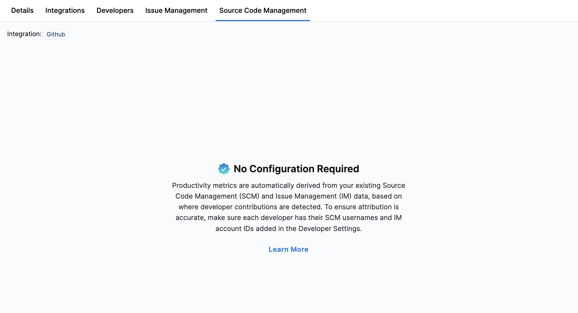 If a developer appears to be missing activity after enabling multiple SCM integrations, verify that all relevant SCM identities are mapped correctly by using the Developer Identities dropdown menu to filter on Missing.