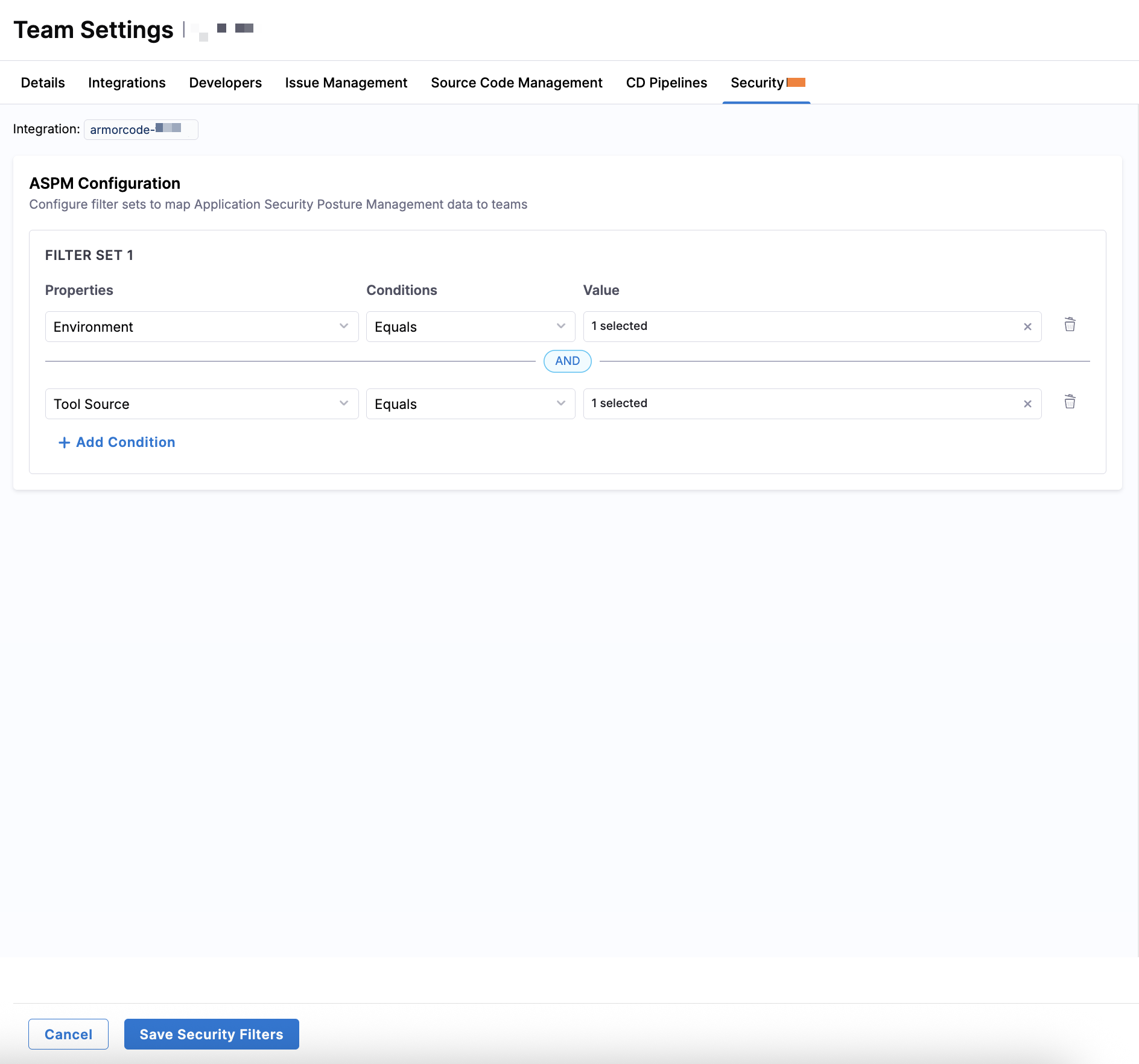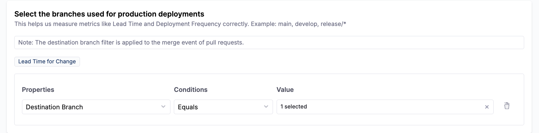 You can add multiple filter sets by clicking + Add Condition. Each additional filter set is combined using AND logic, meaning all filter sets must match for a work item to be included. To remove a filter set, click the Delete icon next to it. Depending on the profile applied to the team, this configuration can impact delivery, reliability, productivity, and business alignment metrics.