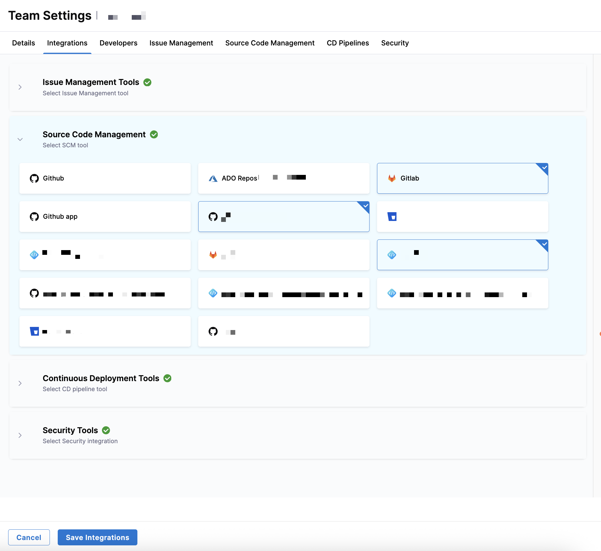 2. Select integrations from the following sections: Issue Management, Source Code Management, Continuous Deployment, Security, and Code Quality. You can select multiple SCM integrations per team.