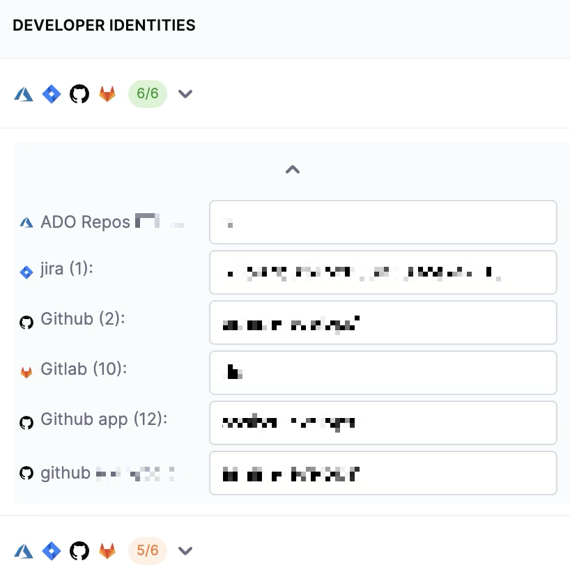 When a team is configured with multiple SCM integrations on the Integrations tab, a single developer may be associated with multiple SCM identities on the Developers tab in Team Settings. Each SCM integration contributes its own developer identifier.