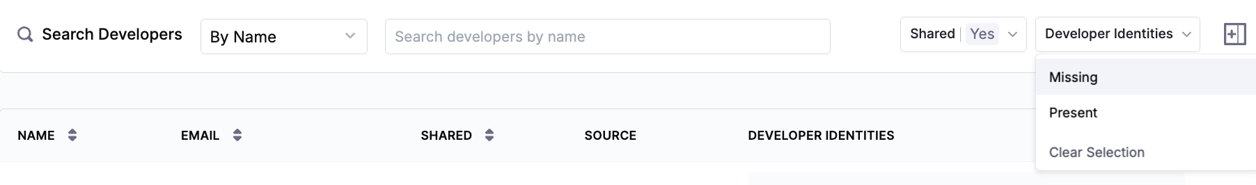 When browsing the Developer Records table, you can search for developers by name or email, filter shared developers using the Shared dropdown menu, and use the Developer Identities dropdown menu to show only records with missing or present developer identities.