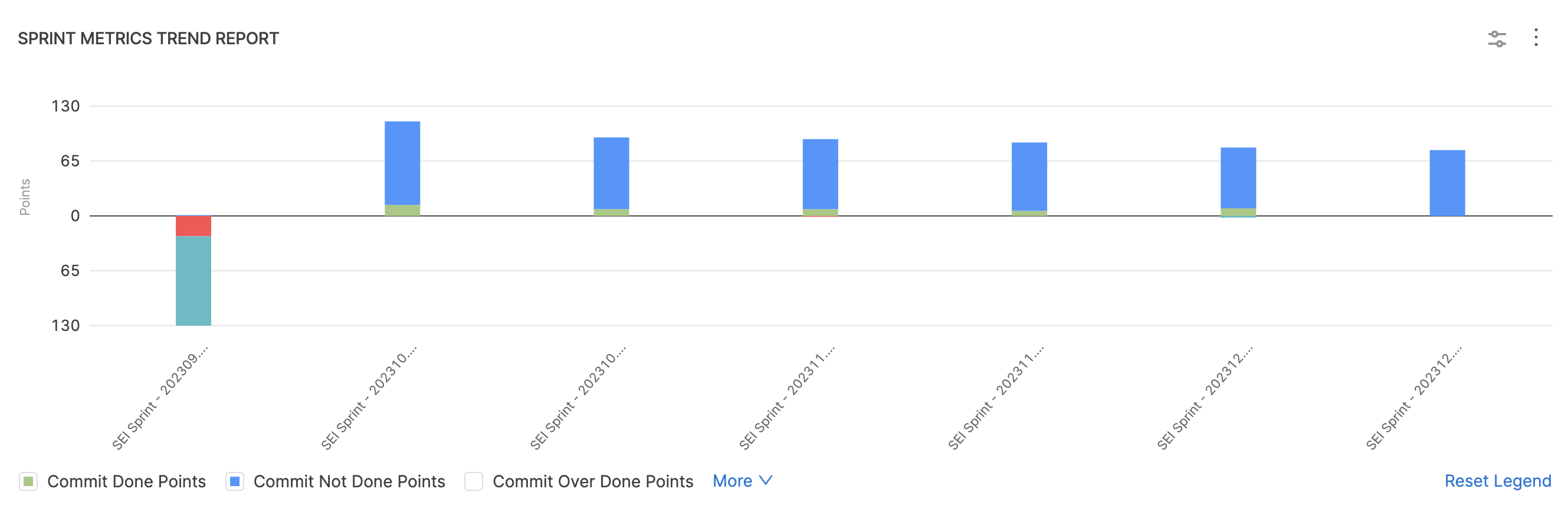 - Meeting Sprint Commitments: The report can be used to visualize the trend of the Commit Done ratio and Done to Commit ratio, helping teams assess their ability to complete the work they committed to during sprint planning.