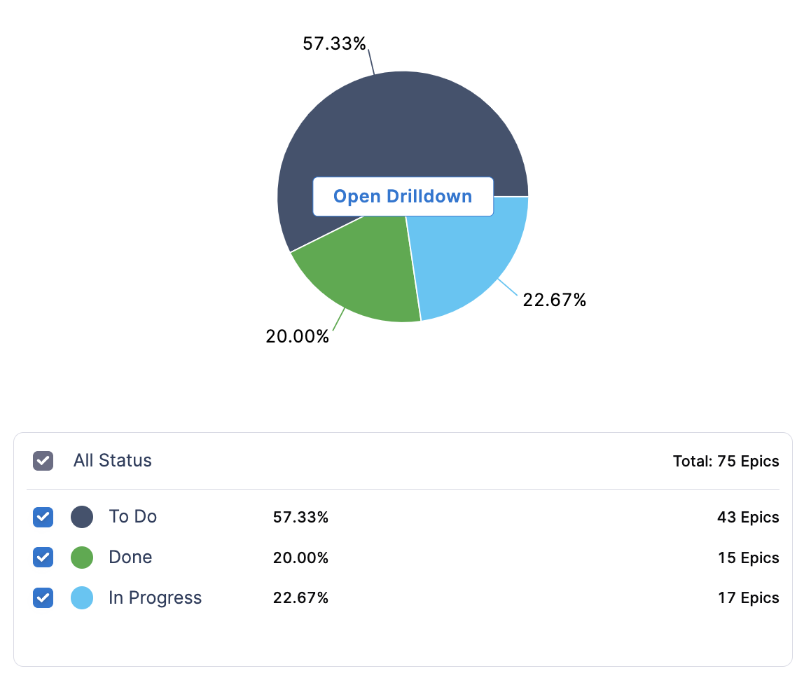 The pie chart displays the distribution of epics by status category (To Do, In Progress, Done). This provides an at-a-glance view of backlog size, active work, and completed projects, helping teams analyze workload distribution and identify bottlenecks.